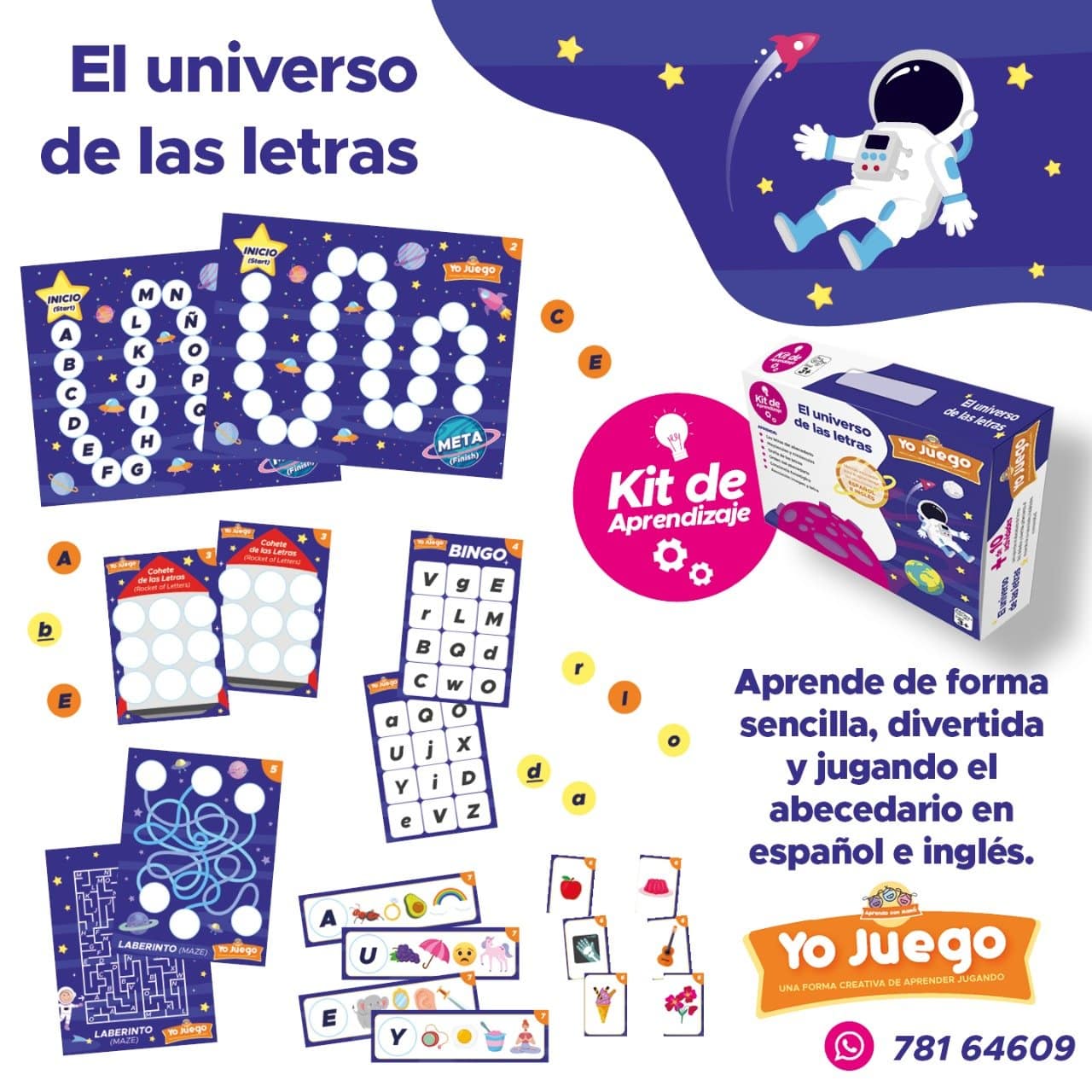 Este kit es una herramienta completa y divertida que ayudará a los niños a comprender y familiarizarse con las letras del abecedario de manera lúdica. A través de variadas actividades, los pequeños aprenderán las letras en mayúsculas y minúsculas, su grafía, la secuencia correcta del abecedario, la conciencia fonológica y mucho más.
