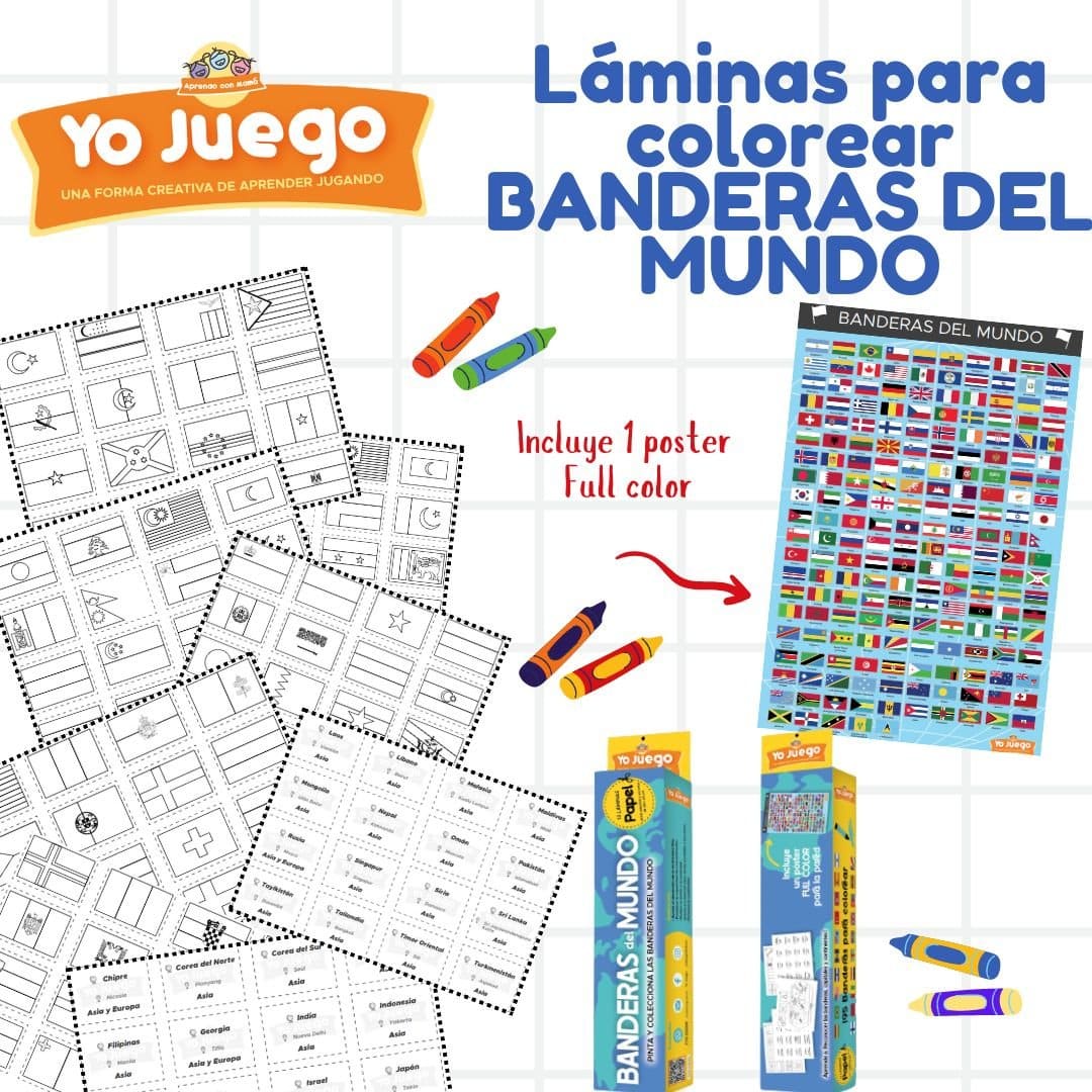 Crea tu propia colección de banderas del mundo, recortando y pintando cada una de ellas. Incluye 1 poster full color con todas las banderas del mundo que servirá de guía para colorear cada bandera. Son 16 láminas con 195 banderas del mundo para recortar y colorear.